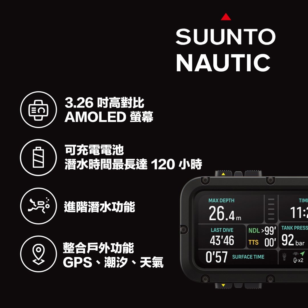 獻給珍惜水下每一刻的潛水員。Suunto Nautic 在每次潛水中結合了性能、耐用性與完全可靠性。它是探索沉船、珊瑚礁、洞穴和開放水域的理想夥伴——從熱衷潛水的潛水愛好者到要求裝備精準與信任的專業潛水員。Nautic 由芬蘭設計與建造,展現了 Suunto 數十年的潛水經驗——隨時準備迎接每一次潛水,無論何處